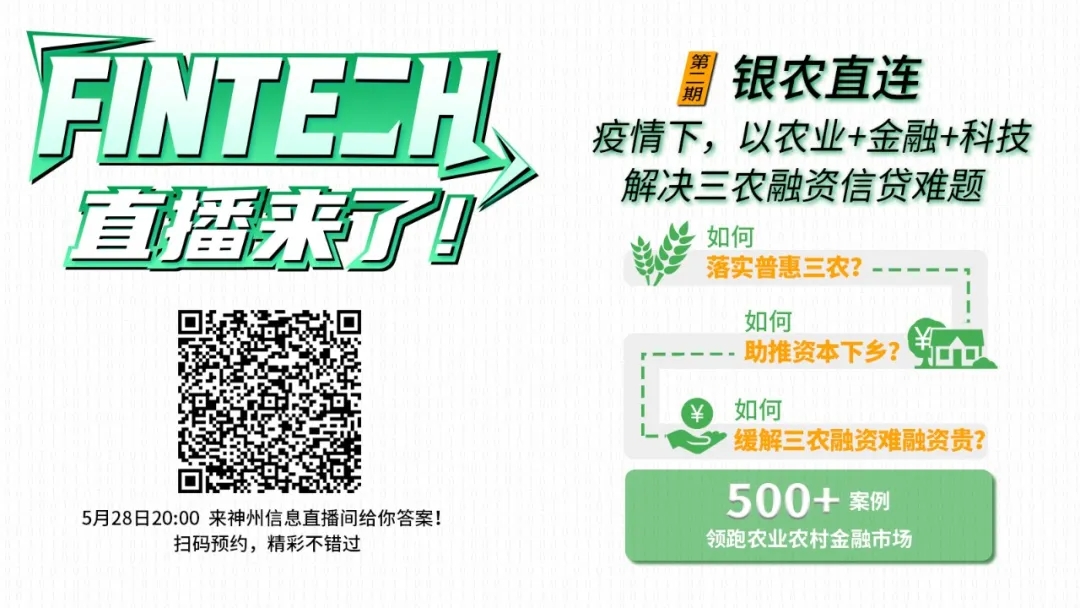 疫情之下,银农直连如何以“农业+金融+科技”解决三农融资信贷难题?今晚八点,神州信息将在【FinTech直播来了·第二期】直播间给您答案!立即扫码预约,或点击阅读原文,精彩不错过!